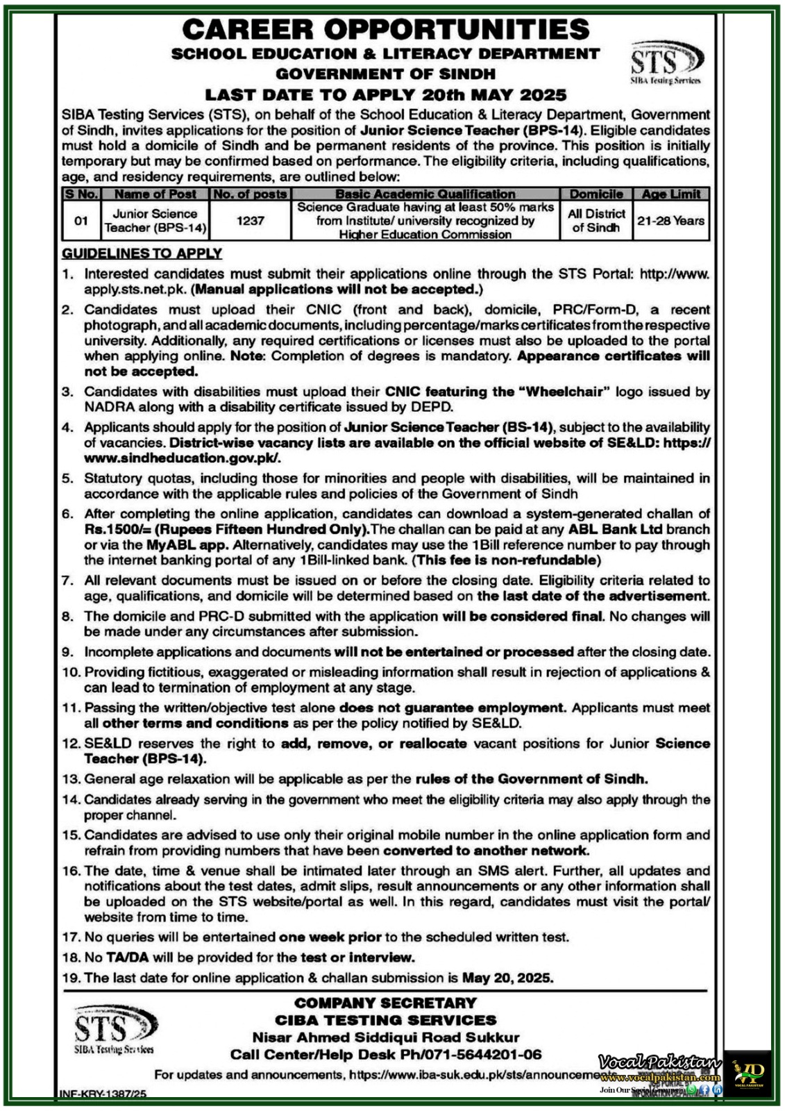 SIBA Testing Services (STS), on behalf of the School Education & Literacy Department, Government of Sindh, invites applications for the position of Junior Science Teacher (BPS-14). Eligible candidates must hold a domicile of Sindh and be permanent residents of the province. This position is initially temporary but may be confirmed based on performance. The eligibility criteria, including qualifications, age, and residency requirements, are outlined below: