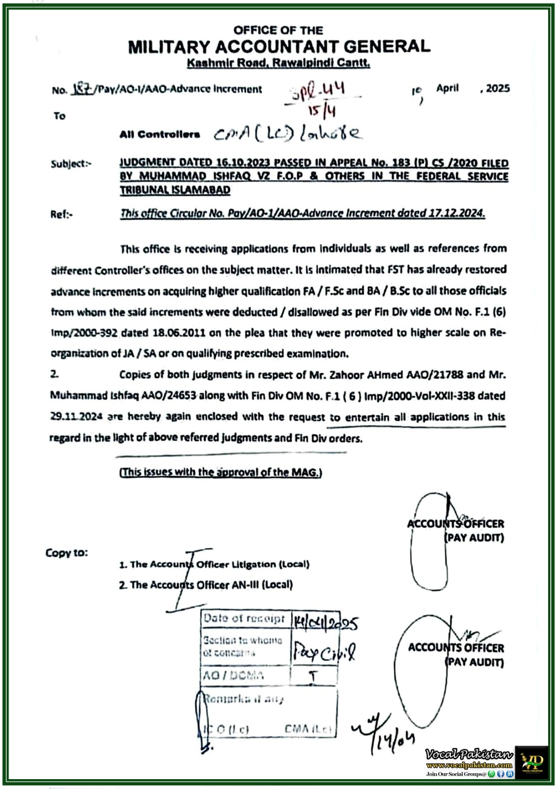 In a welcome move for government employees, the Office of the Military Accountant General (MAG), Rawalpindi, has issued a new government notification following a key decision by the Federal Service Tribunal (FST), Islamabad. The tribunal’s judgment dated October 16, 2023, in Appeal No. 183(P)CS/2020, filed by Muhammad Ishfaq vs FOP & others, has led to the restoration of advance increments for officials who acquired higher qualifications such as FA/F.Sc or BA/B.Sc.