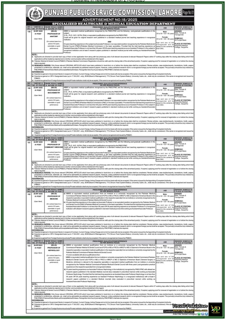 The Punjab Public Service Commission (PPSC) has published Advertisement No. 18/2025 announcing high-ranking BS-20 Government Jobs across several medical specialties under the Specialized Healthcare & Medical Education Department. Published on 21st May 2025, this job notification is a golden opportunity for highly qualified individuals to secure prestigious professor positions in Punjab’s top medical institutions.