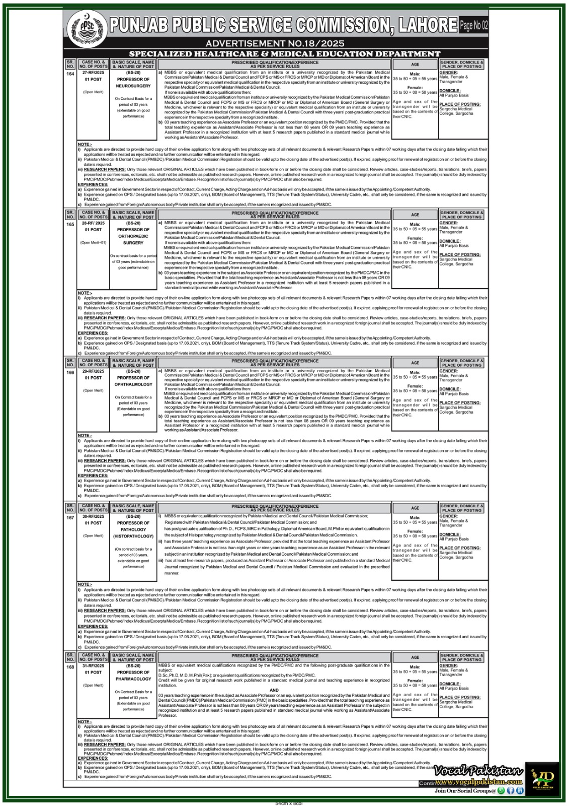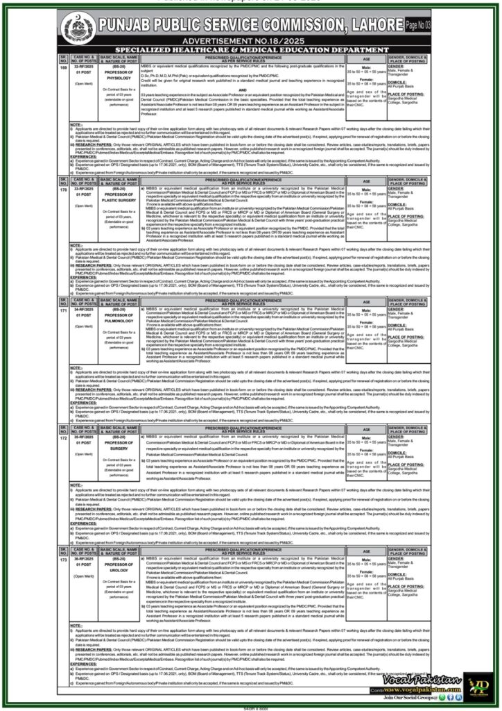 From Professor of Medicine, Neurosurgery, Orthopedic Surgery to Plastic Surgery and Pulmonology, multiple disciplines are open for recruitment. All appointments will be made in BS-20, ensuring attractive pay packages, long-term job security, and career growth in the public healthcare sector. These positions will be filled strictly on merit as per PPSC rules and policies. Please find job details: