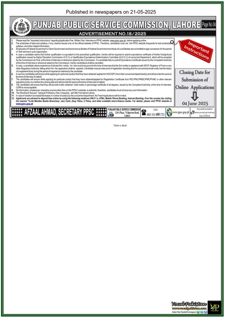 With the deadline approaching on 4th June 2025, don’t delay. Visit PPSC’s official portal, apply online, and prepare thoroughly. Bookmark Vocal Pakistan for regular updates on government job alerts, PPSC recruitment, and more high-authority notifications.