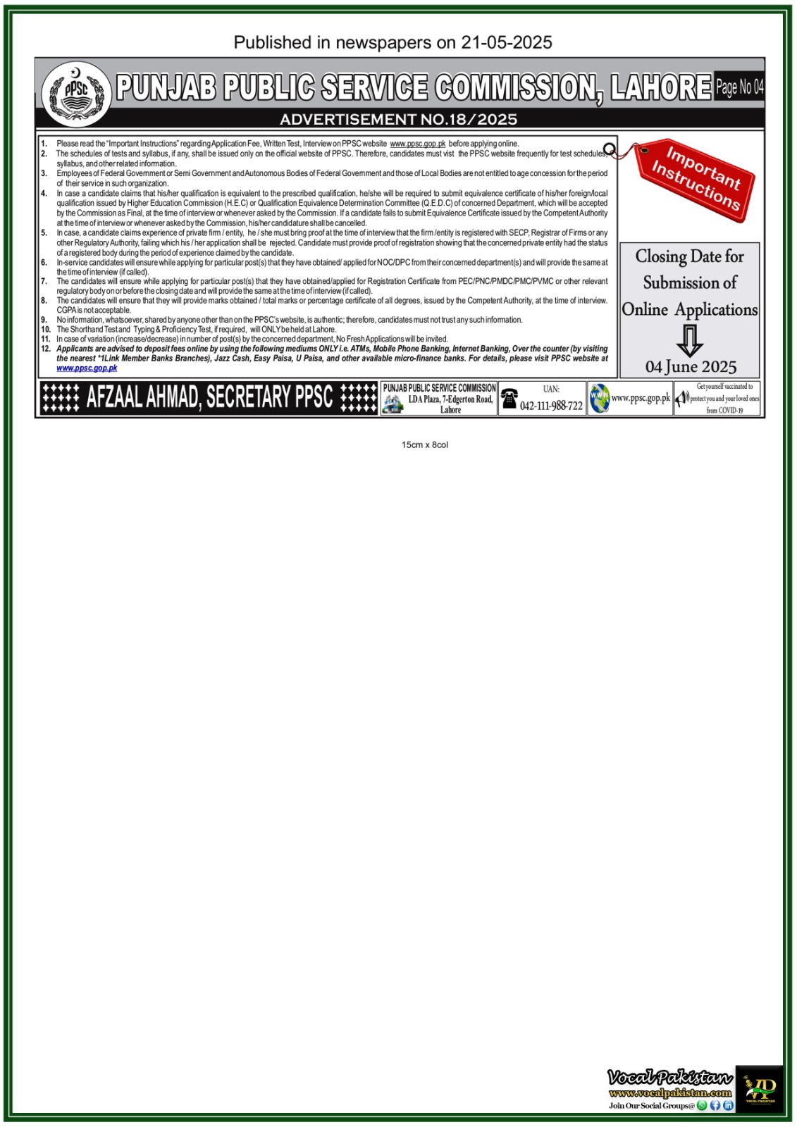 Punjab public service commission has announced the recruitments plan for the following departments through advertisement No. 18/2025 published in newspapers on 21-05-2025. The details is as under: