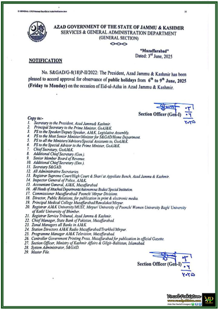 No. S&GAD/G-8(18)P-II/2022: The President, Azad Jammu & Kashmir has been pleased to accord approval for observance of public holidays from 6th to 9th June, 2025 (Friday to Monday) on the occasion of Eid-ul-Azha in Azad Jammu & Kashmir.