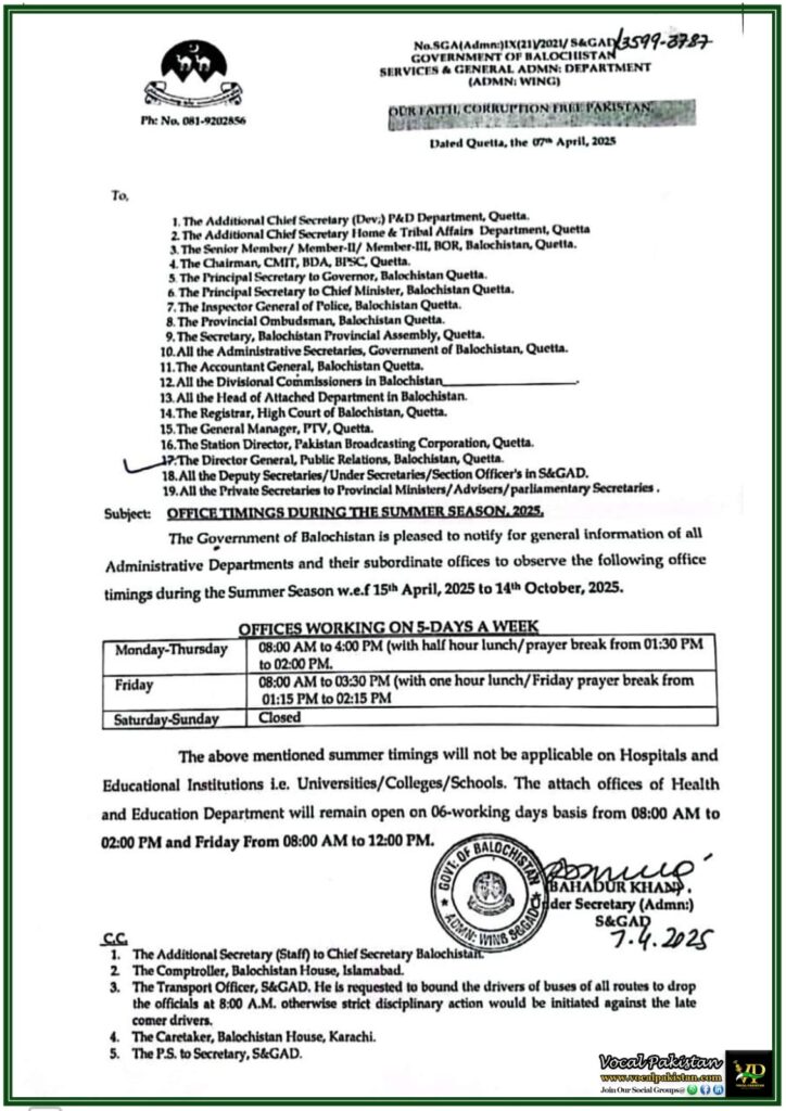 The Government of Balochistan is pleased to notify for general information of all Administrative Departments and their subordinate offices to observe the following office timings during the Summer Season w.e.f 15th April, 2025 to 14th October, 2025.