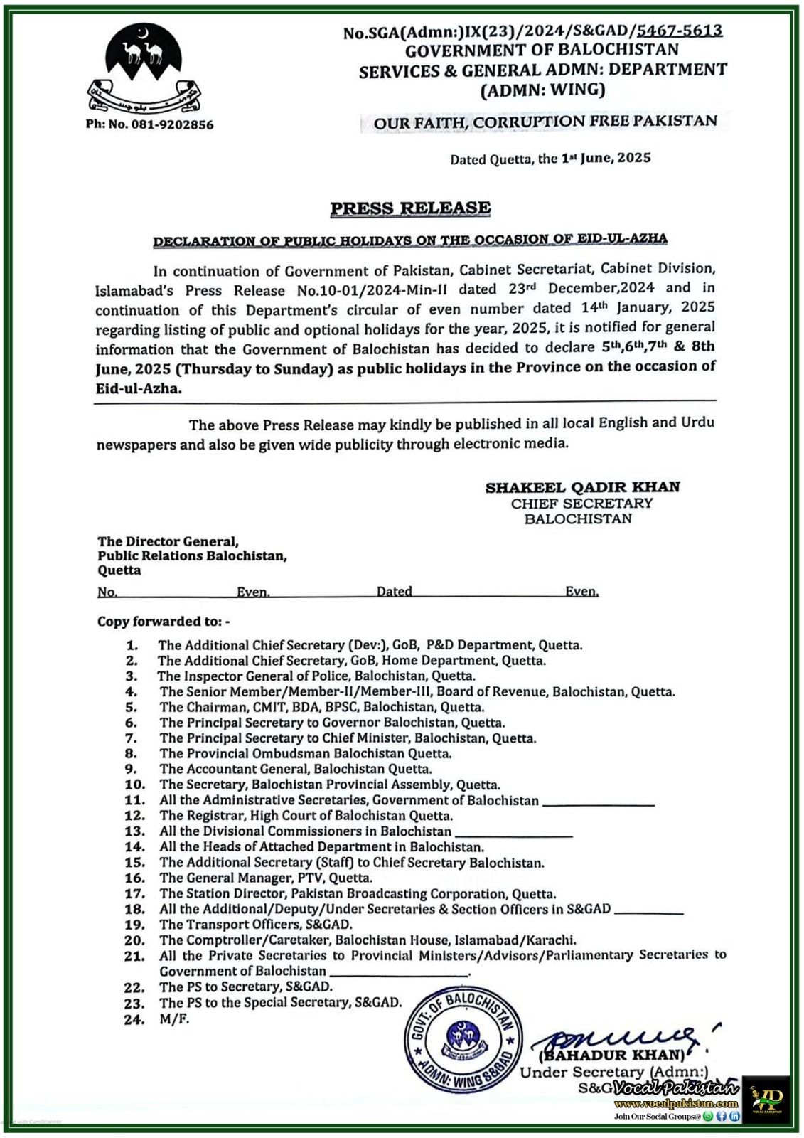 In continuation of Government of Pakistan, Cabinet Secretariat, Cabinet Division, Islamabad’s Press Release No.10-01/2024-Min-II dated 23rd December,2024 and in continuation of this Department’s circular of even number dated 14th January, 2025 regarding listing of public and optional holidays for the year, 2025, it is notified for general information that the Government of Balochistan has decided to declare 5th, 6th, 7th & 8th June, 2025 (Thursday to Sunday) as public holidays in the Province on the occasion of Eid-ul-Azha.