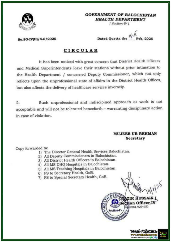 The Government of Balochistan Health Department has issued a strict circular addressing the unauthorized absence of District Health Officers (DHOs) and Medical Superintendents (MSs) from their assigned stations. This practice has been found to disrupt healthcare services across the province, creating inefficiencies in patient care and administrative duties.