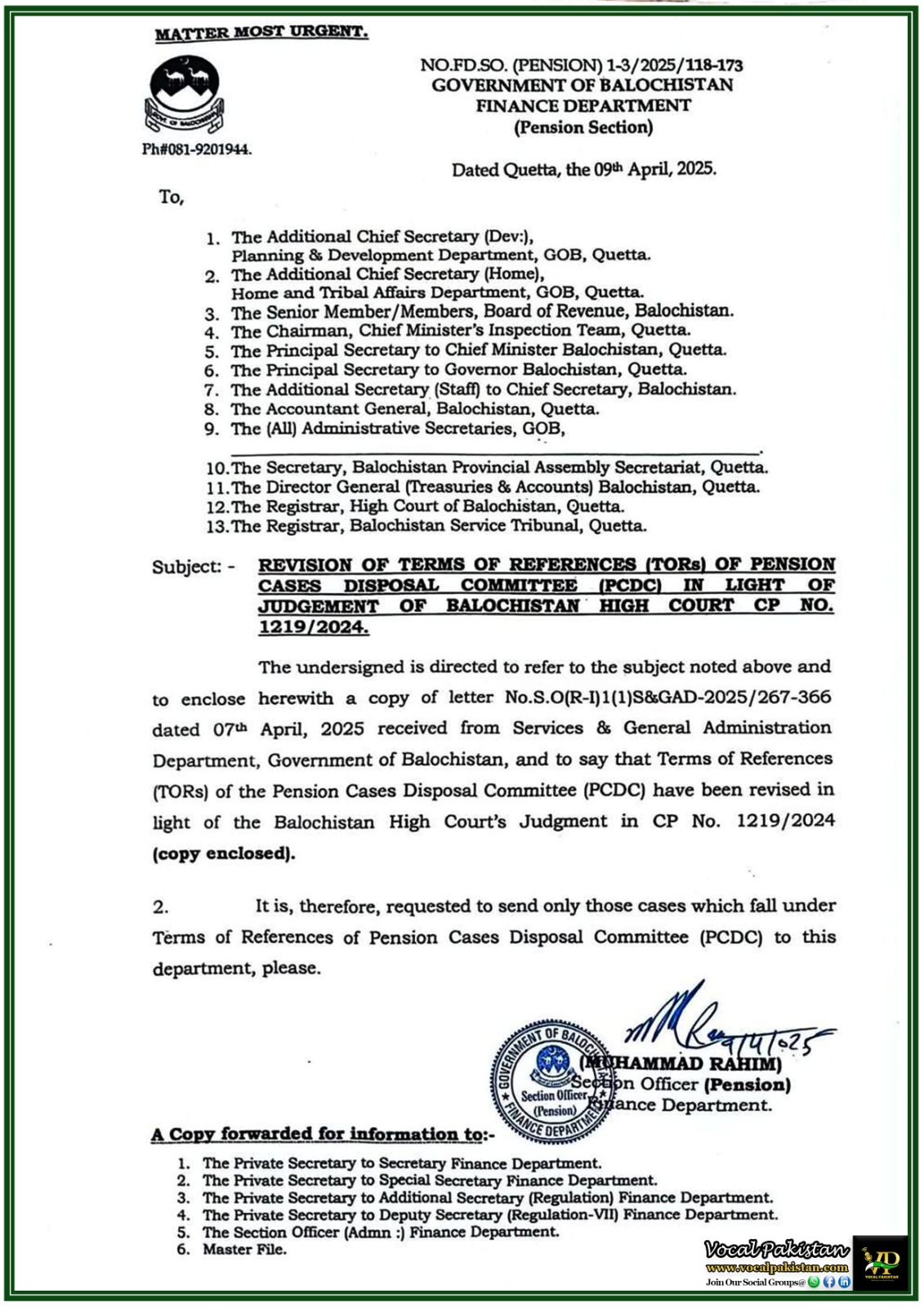The undersigned is directed to refer to the subject noted above and to enclose herewith a copy of letter No.S.O(R-I)1(1)S&GAD-2025/267-366 dated 07th April, 2025 received from Services & General Administration Department, Government of Balochistan, and to say that Terms of References (TORS) of the Pension Cases Disposal Committee (PCDC) have been revised in light of the Balochistan High Court’s Judgment in CP No. 1219/2024 (copy enclosed).