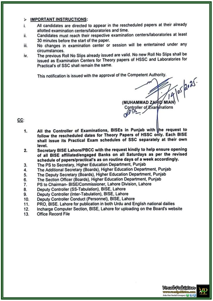At Vocal Pakistan, we provide real-time updates on BISE Lahore notifications, Punjab Education Department news, Matric date sheets, and Intermediate exam schedules to help students and parents stay fully informed. Please find notification: