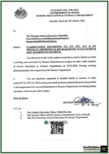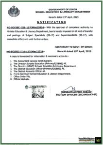 Notification / OM No. NO.SO(G-III)SE&LD/RSU/4-1421/25 Dated 27-May-2025 Notification Issued By: School Education & Literacy Department, Government Of Sindh Sindh