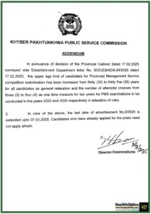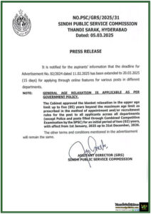 Notification / OM No. NO.PSC/GRS/2025/31 Dated 05-March-2025 Notification Issued By: Sindh Public Service Commission (SPSC) SPSC Extends Application Deadline