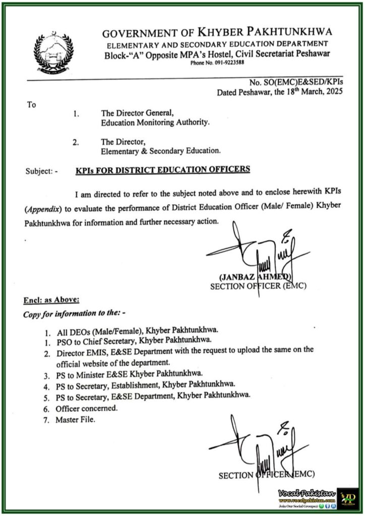 I am directed to refer to the subject noted above and to enclose herewith KPIs (Appendix) to evaluate the performance of District Education Officer (Male/ Female) Khyber Pakhtunkhwa for information and further necessary action.