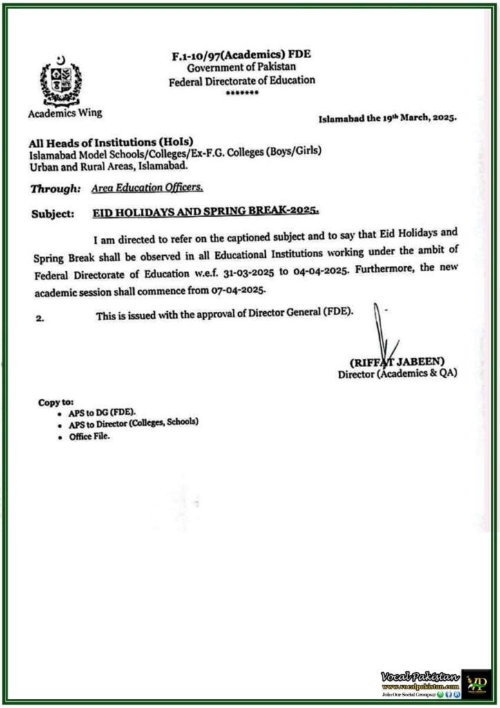 I am directed to refer on the captioned subject and to say that Eid Holidays and Spring Break shall be observed in all Educational Institutions working under the ambit of Federal Directorate of Education w.e.f. 31-03-2025 to 04-04-2025. Furthermore, the new academic session shall commence from 07-04-2025.