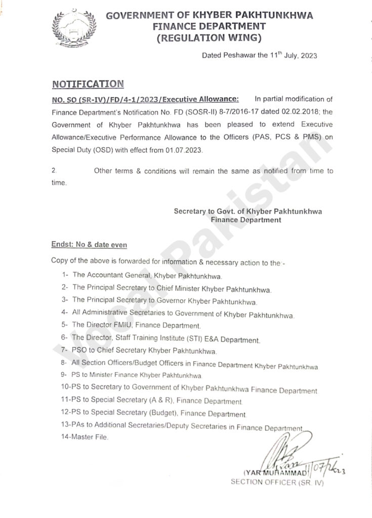 NO. SO (SR-IV)/FD/4-1/2023/Executive Allowance: In partial modification of Finance Department’s Notification No. FD (SOSR-II) 8-7/2016-17 dated 02.02.2018; the Government of Khyber Pakhtunkhwa has been pleased to extend Executive Allowance/Executive Performance Allowance to the Officers (PAS, PCS & PMS) on Special Duty (OSD) with effect from 01.07.2023.