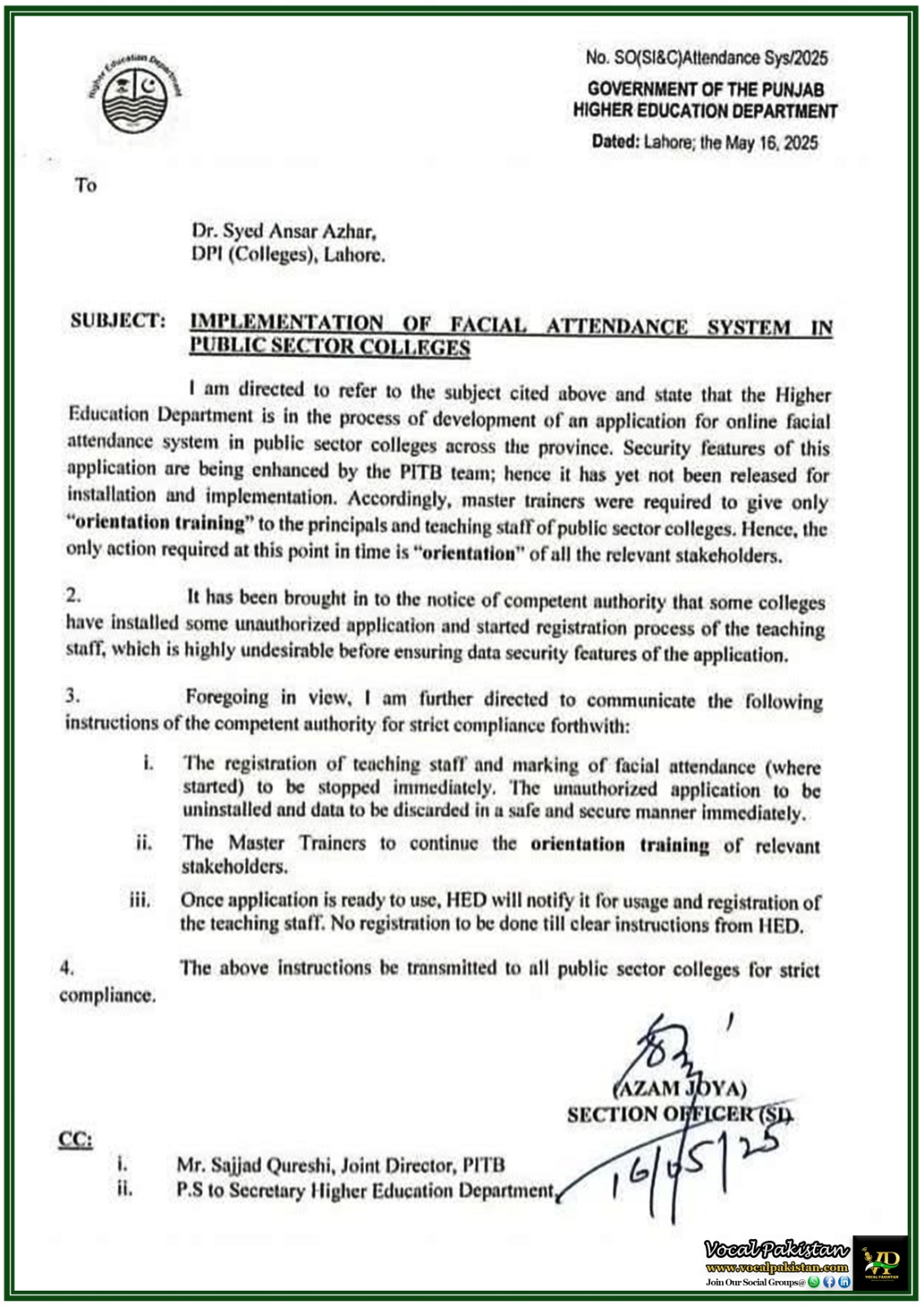 The Government of Punjab’s Higher Education Department (HED) has issued an important notification dated 16th May 2025, clarifying the current status of the facial recognition attendance system being developed for public sector colleges.