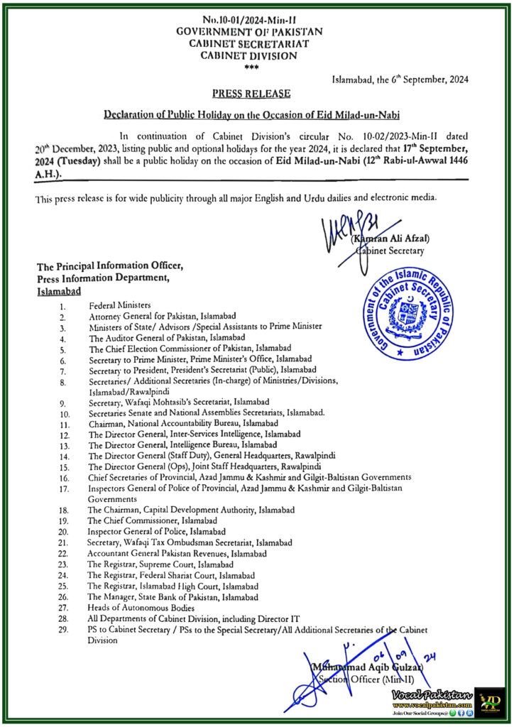 In continuation of Cabinet Division’s circular No. 10-02/2023-Min-II dated 20th December, 2023, listing public and optional holidays for the year 2024, it is declared that 17th September, 2024 (Tuesday) shall be a public holiday on the occasion of Eid Milad-un-Nabi (12th Rabi ul Awwal 1446 A.H.).