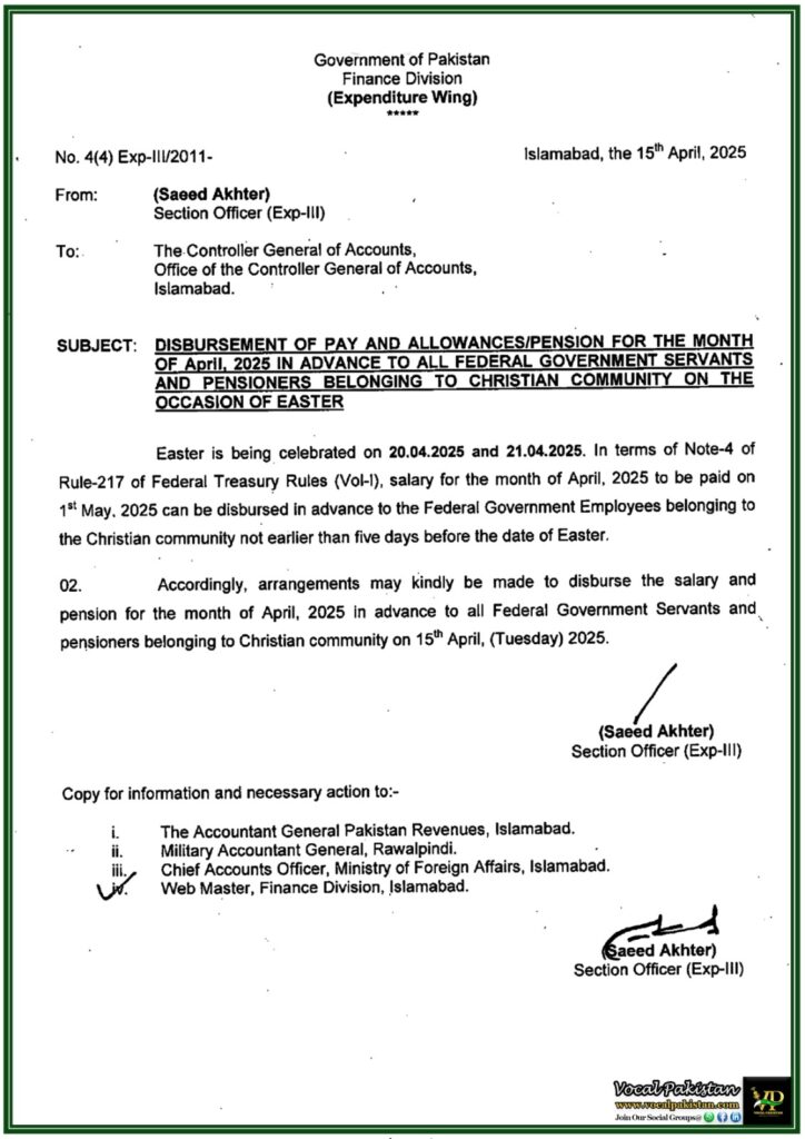 02. Accordingly, arrangements may kindly be made to disburse the salary and pension for the month of April, 2025 in advance to all Federal Government Servants and pensioners belonging to Christian community on 15th April, (Tuesday) 2025.
