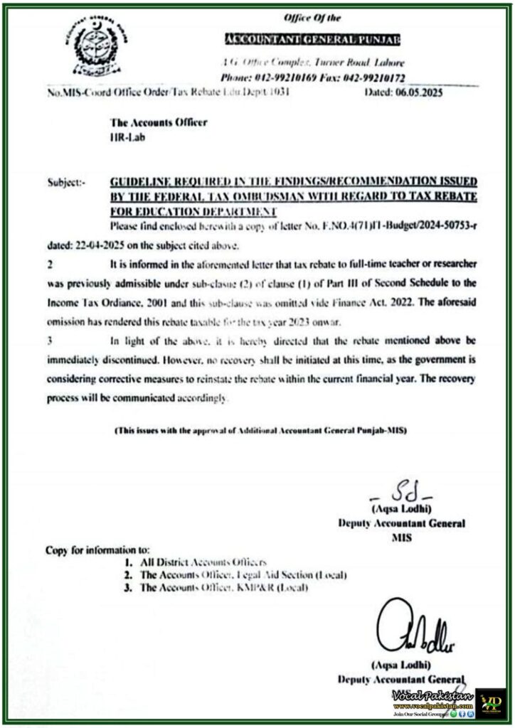 The discontinuation of the tax rebate for teachers and researchers has sparked considerable discussion within academic and financial sectors. While the Accountant General Punjab has directed an immediate halt to the rebate, the decision not to initiate recovery at this point hints at possible relief in the near future. There’s growing hope that the Government of Pakistan may reintroduce this rebate in the upcoming Federal Budget 2025–26, especially under mounting pressure from educational unions and policy advocates.