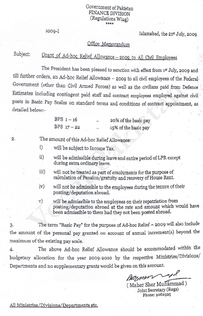 The President has been pleased to sanction with effect from 1st July, 2009 and till further orders, an Ad-hoc Relief Allowance – 2009 to all civil employees of the Federal, Government (other than Civil Armed Forces) as well as the civilians paid from Defence Estimates including contingent paid staff and contract employees employed against civil posts in Basic Pay Scales on standard terms and conditions of contract appointment, as detailed below: