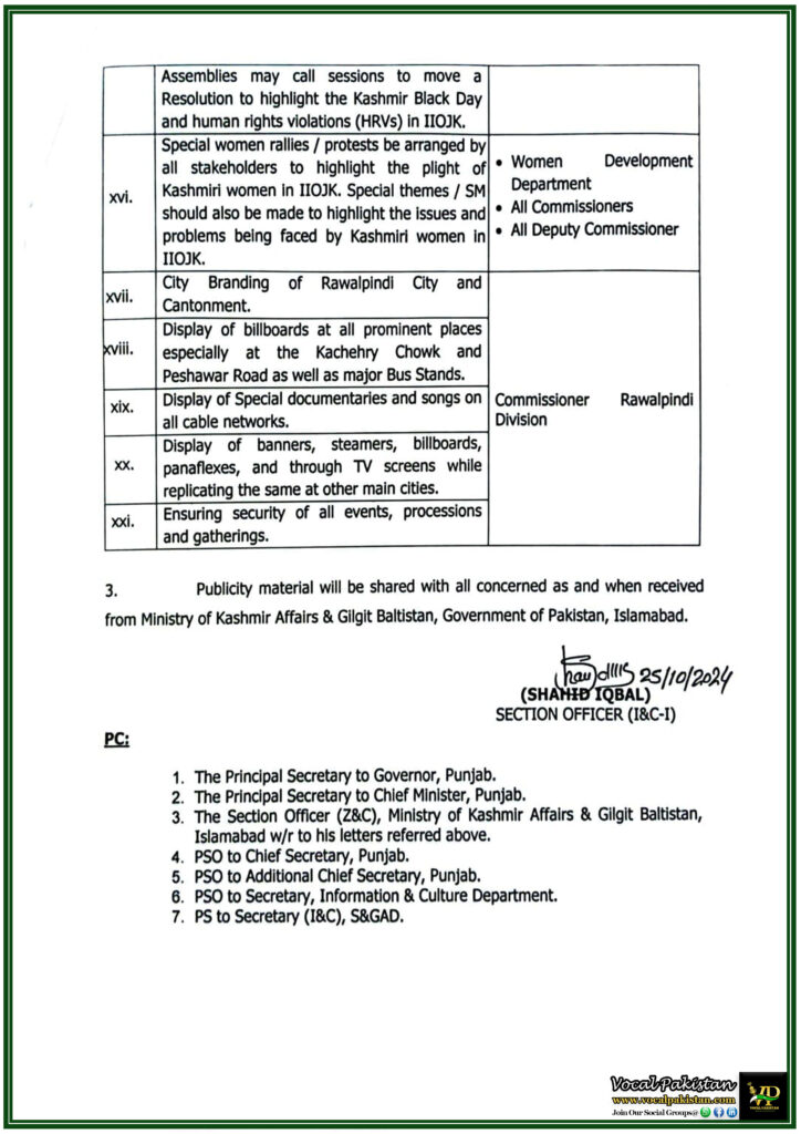 2.                   I am further directed to request that the following activities / programs shall be carried out by your respective Offices / Departments / Organizations as per direction of the Competent Authority as well as Federal Government contained in Para-2(10), (12) & General Decisions of minutes ibid read with Para-1 (D) (G) & (3) of Working Paper ibid, to highlight the Indian atrocities and plight of Kashmiris in Indian Occupied Jammu & Kashmir:-