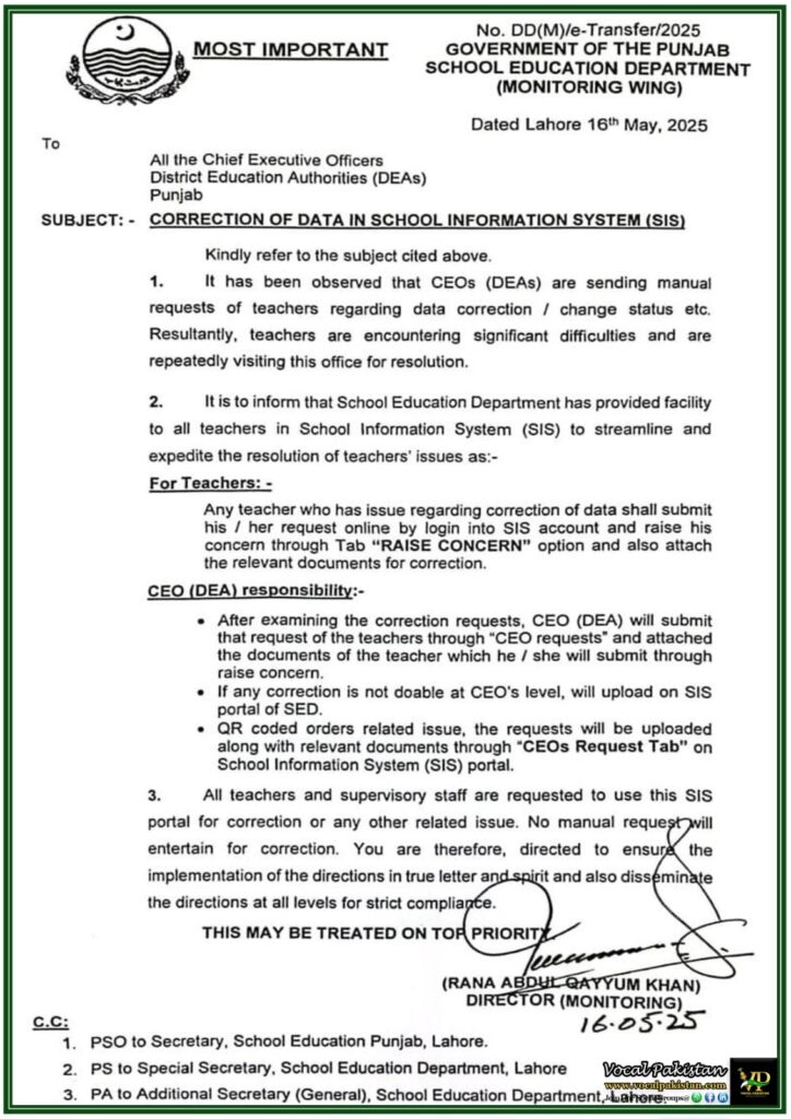The Government of Punjab’s School Education Department (Monitoring Wing) has issued a strict directive dated 16th May 2025, addressing a recurring problem faced by thousands of teachers in Punjab. The issue? Teachers have been submitting manual requests for data corrections in the School Information System (SIS), causing unnecessary delays, confusion, and frequent office visits.