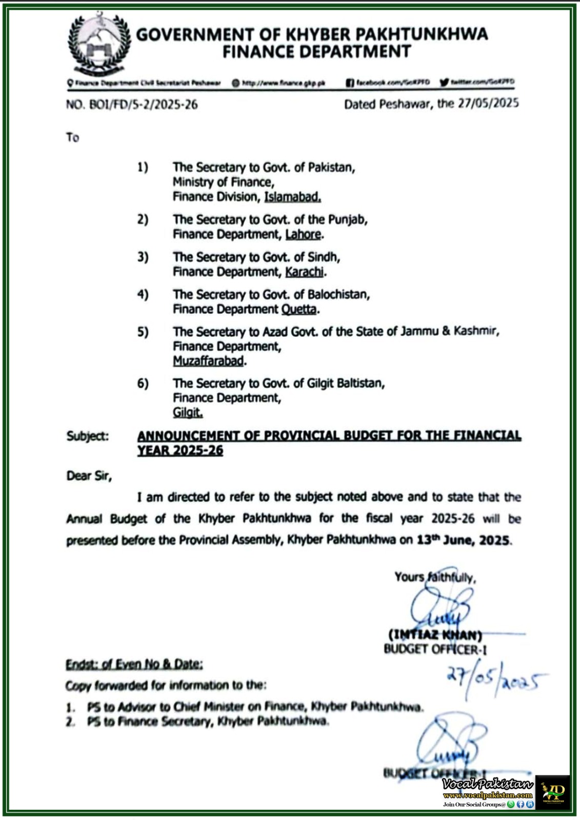I am directed to refer to the subject noted above and to state that the Annual Budget of the Khyber Pakhtunkhwa for the fiscal year 2025-26 will be presented before the Provincial Assembly, Khyber Pakhtunkhwa on 13th June, 2025.
