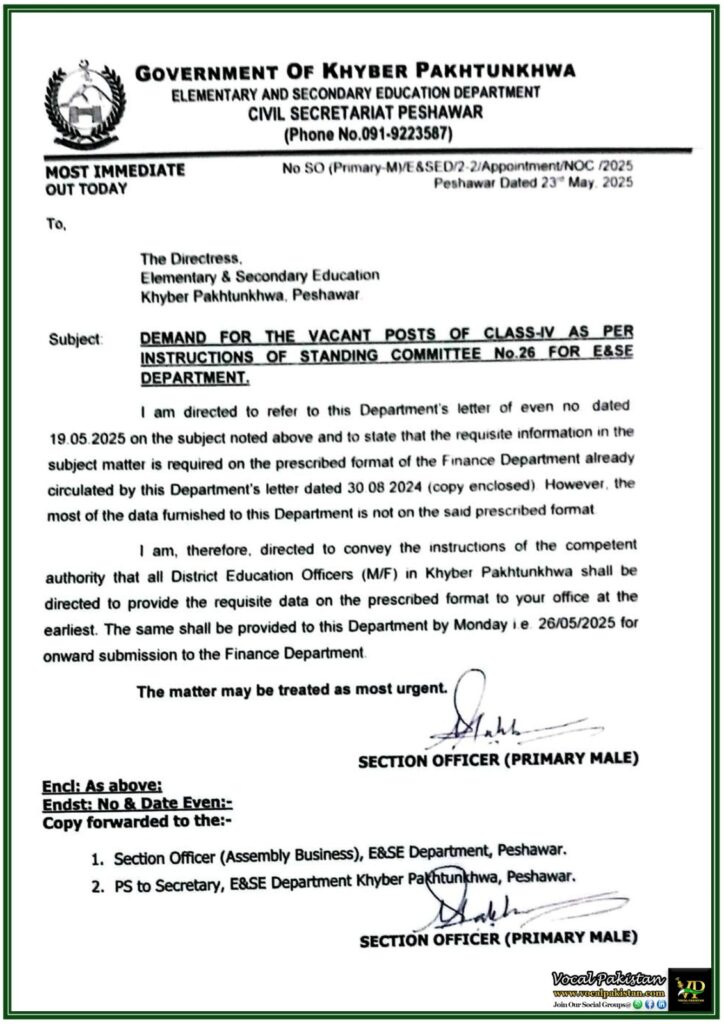 Deadline Approaches Fast! KPK DEOs Must Submit Class-IV Vacancy Data in Correct Format by May 26 :