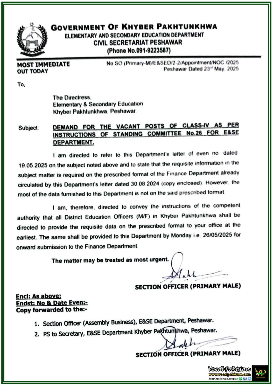 The Government of Khyber Pakhtunkhwa’s Elementary and Secondary Education Department (E&SED) has issued a “Most Immediate” notification on 23rd May 2025, directing all District Education Officers (Male/Female) to urgently furnish the vacant Class-IV posts data in the prescribed format.