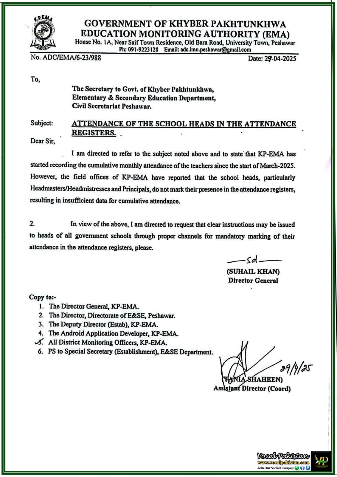 I am directed to refer to the subject noted above and to state that KP-EMA has started recording the cumulative monthly attendance of the teachers since the start of March-2025. However, the field offices of KP-EMA have reported that the school heads, particularly Headmasters/ Headmistresses and Principals, do not mark their presence in the attendance registers, resulting in insufficient data for cumulative attendance.
