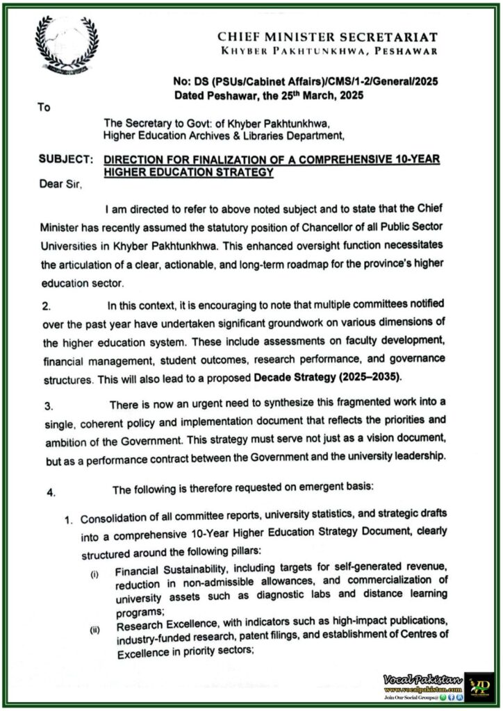 I am directed to refer to above noted subject and to state that the Chief Minister has recently assumed the statutory position of Chancellor of all Public Sector Universities in Khyber Pakhtunkhwa. This enhanced oversight function necessitates the articulation of a clear, actionable, and long-term roadmap for the province’s higher education sector.