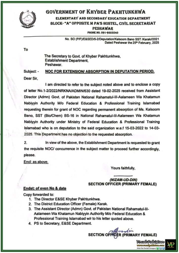 I am directed to refer to the subject noted above and to enclose a copy of letter No.1-2/2022/NRKNA/ADMIN/630 dated 19-02-2025 received from Assistant Director (Admn) Govt. of Pakistan National Rahamatul-lil-Aalameen Wa Khatamun Nabiyyin Authority M/o Federal Education & Professional Training Islamabad requesting therein for grant of NOC regarding permanent absorption of Ms. Kalsoom Bano, SST (Bio/Chem) BS-16 in National Rahamatul-lil-Aalameen Wa Khatamun Nabiyyin Authority under Ministry of Federal Education & Professional Training Islamabad who is on deputation to the said organization w.e.f 15-03-2022 to 14-03- 2025. This Department has no objection to the requested absorption.