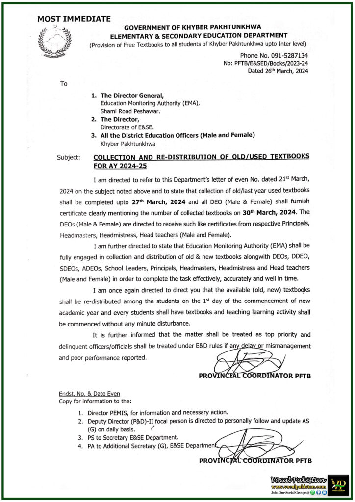 I am directed to refer to this department’s letter of even No. dated 21st March, 2024 on the subject noted above and to state collection of old/last year used textbooks shall be completed up to 27th March 2024 and all DEOs (Male & Female) shall furnish a certificate clearly mentioning the number of collected textbooks on 30th March 2024. The DEOs (Make & Female) are directed to receive such certificates from respective Principals, Headmaster, Headmistress, and Head teacher (Male and Female).