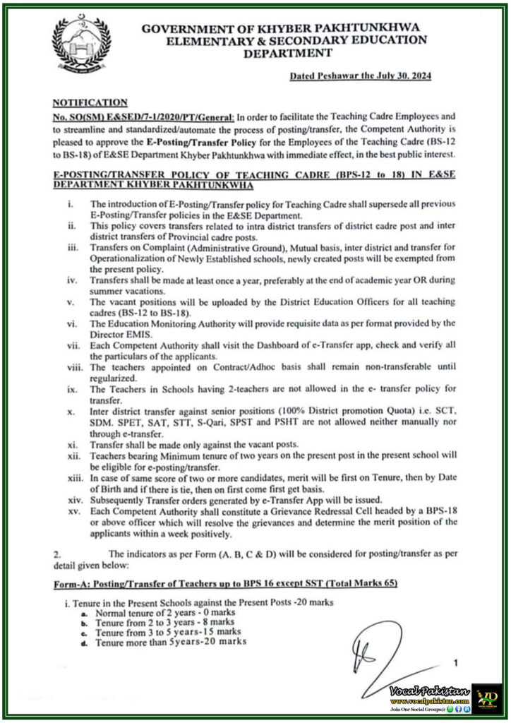 No. SO(SM) E&SED/7-1/2020/PT/General: In order to facilitate the Teaching Cadre Employees and to streamline and standardized/automate the process of posting/transfer, the Competent Authority is pleased to approve the E-Posting/Transfer Policy for the Employees of the Teaching Cadre (BS-12 to BS-18) of E&SE Department Khyber Pakhtunkhwa with immediate effect, in the best public interest.