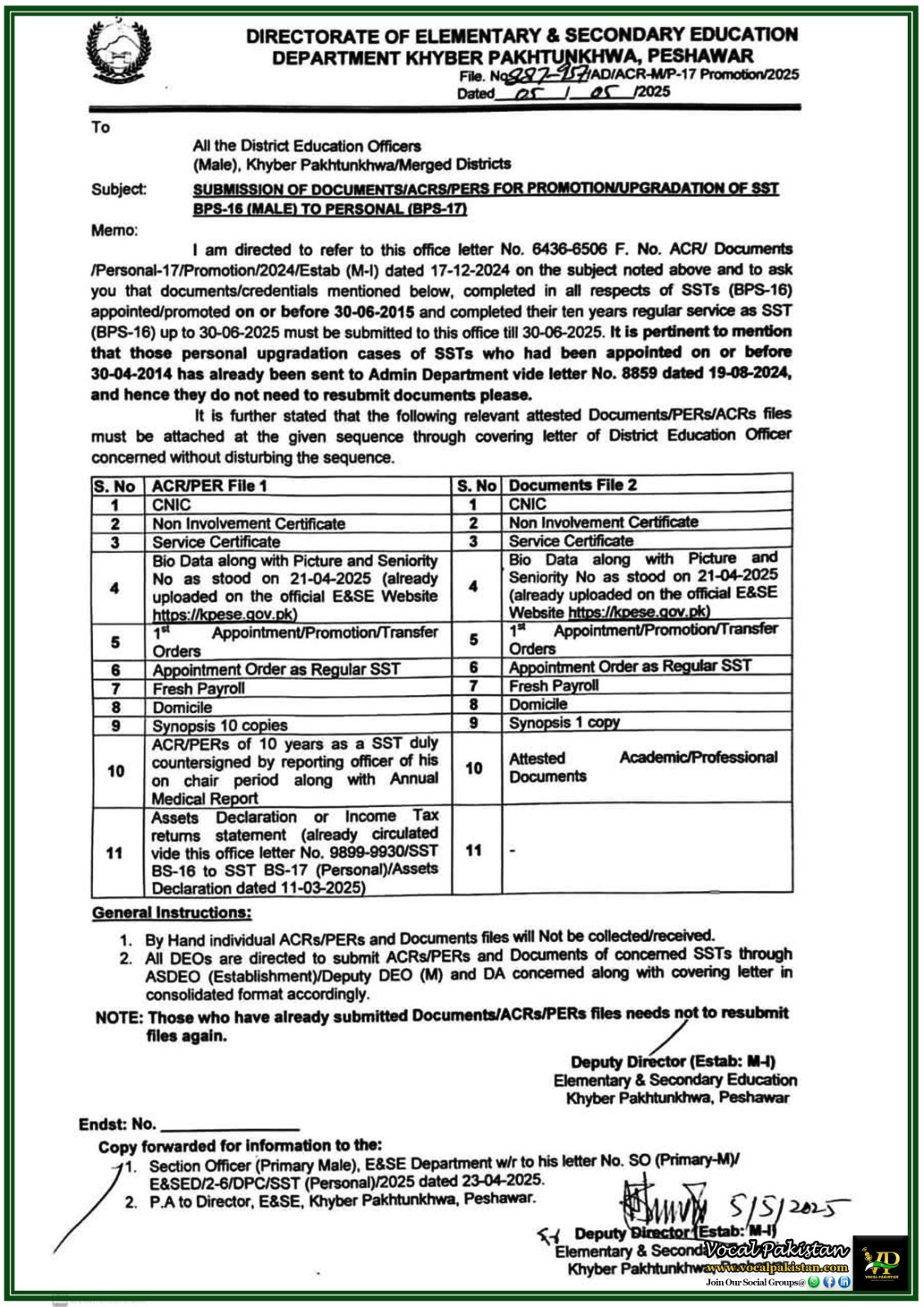 Notification / OM No. No 9663-9733 F.No. Letters to DEOs/SO(PE)/DPC/DSC/Estab-1 M. Dated 28-April-2025...