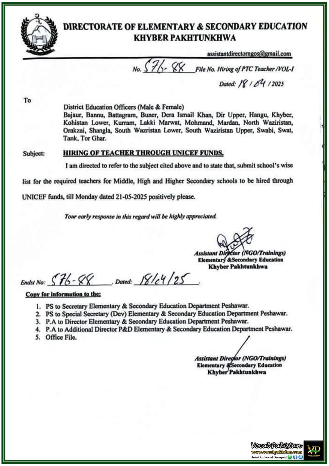 Notification / OM No. No. 8745-94/A-23/MS/Gen Instruction Dated 22-April-2025 Notification Issued By: Directorate...