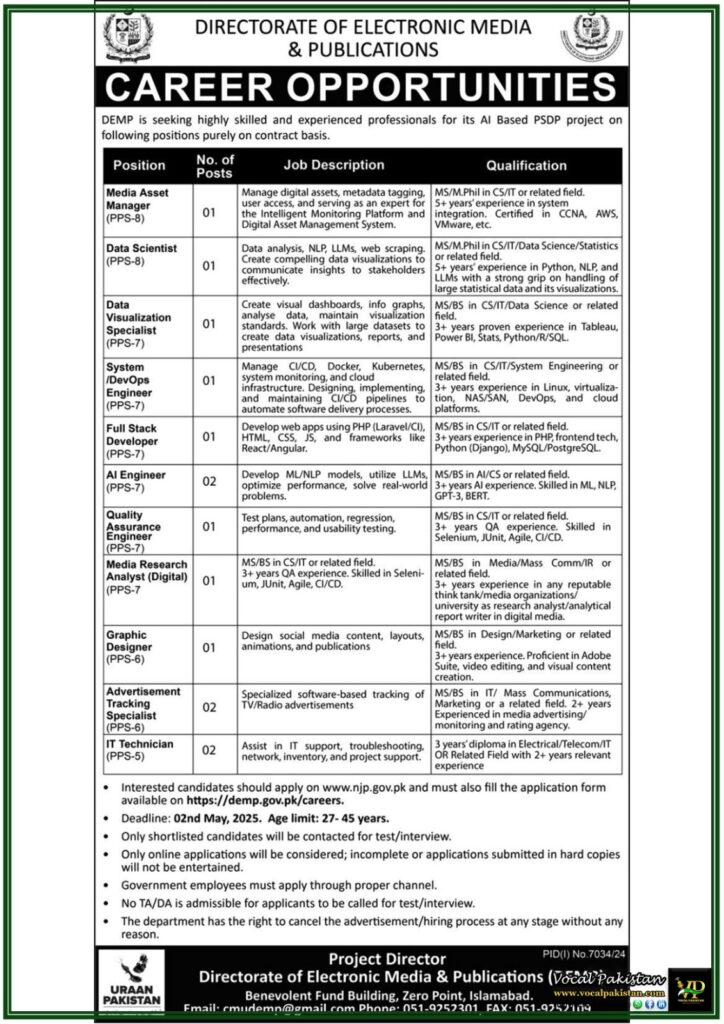 These contract-based positions range from Media Asset Manager and AI Engineer to Quality Assurance Engineer and IT Technician. The job location is Islamabad, and only online applications are being accepted via the National Job Portal and DEMP’s official website. With attractive pay packages, modern work culture, and the opportunity to work on cutting-edge technology, these vacancies are among the most in-demand government jobs in Pakistan right now. Don’t miss this incredible opportunity to become part of a transformative national project. Please find Jobs;
