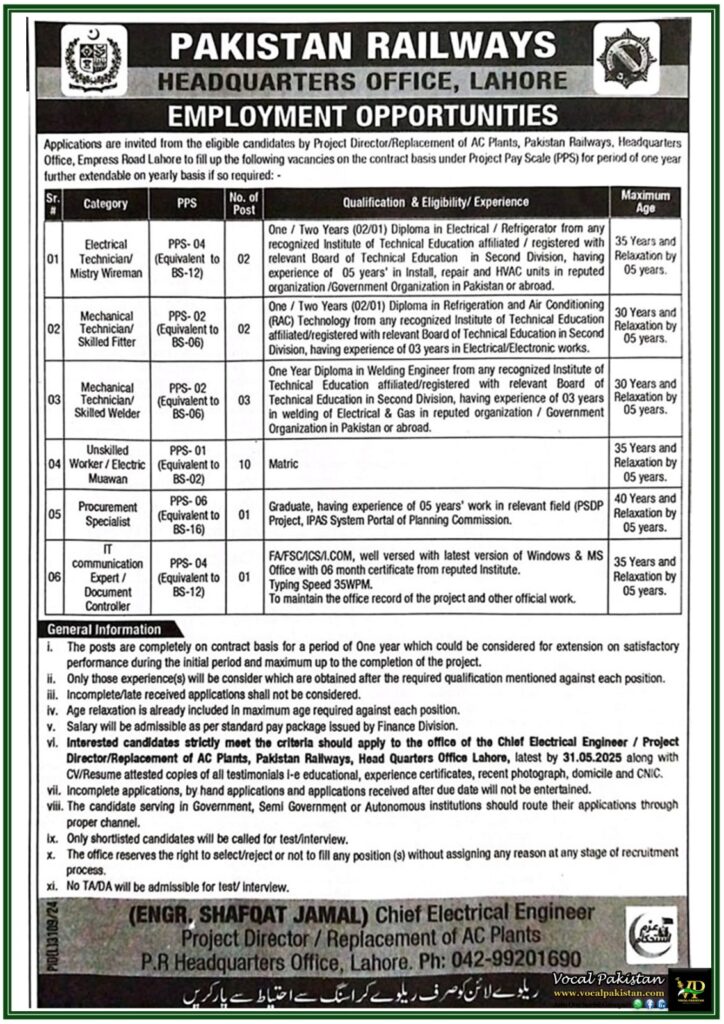 vi.           Interested candidates strictly meet the criteria should apply to the office of the Chief Electrical Engineer / Project Director/Replacement of AC Plants, Pakistan Railways, Head Quarters Office Lahore, latest by 31.05.2025 along with CV/Resume attested copies of all testimonials l-e educational, experience certificates, recent photograph, domicile and CNIC.