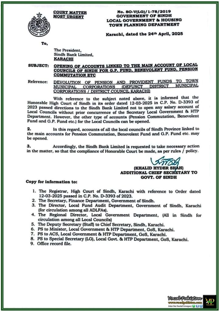 With reference to the subject noted above, it is informed that the Honorable High Court of Sindh in its order dated 12-03-2025 in C.P. No. D-3393 of 2023 passed directions to the Sindh Bank Limited not to open any salary account of Local Councils without prior concurrence of the Secretary Local Government & HTP Department. However, the other type of accounts (Pension Commutation, Benevolent Fund and G.P. Fund etc.) for the Local Councils can be opened.