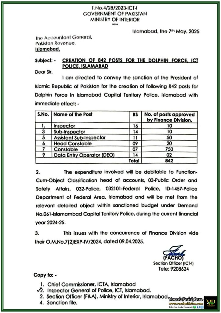 I am directed to convey the sanction of the President of Islamic Republic of Pakistan for the creation of following 842 posts for Dolphin Force in Islamabad Capital Territory Police, Islamabad with immediate effect: –