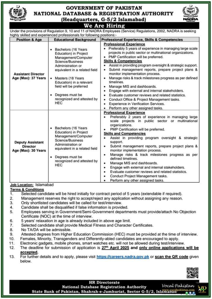Trending search terms like NADRA careers portal, government vacancies April 2025, NADRA Assistant Director jobs, and online jobs in Pakistan public sector make this posting one of the most searched in recent days. Please find Jobs: