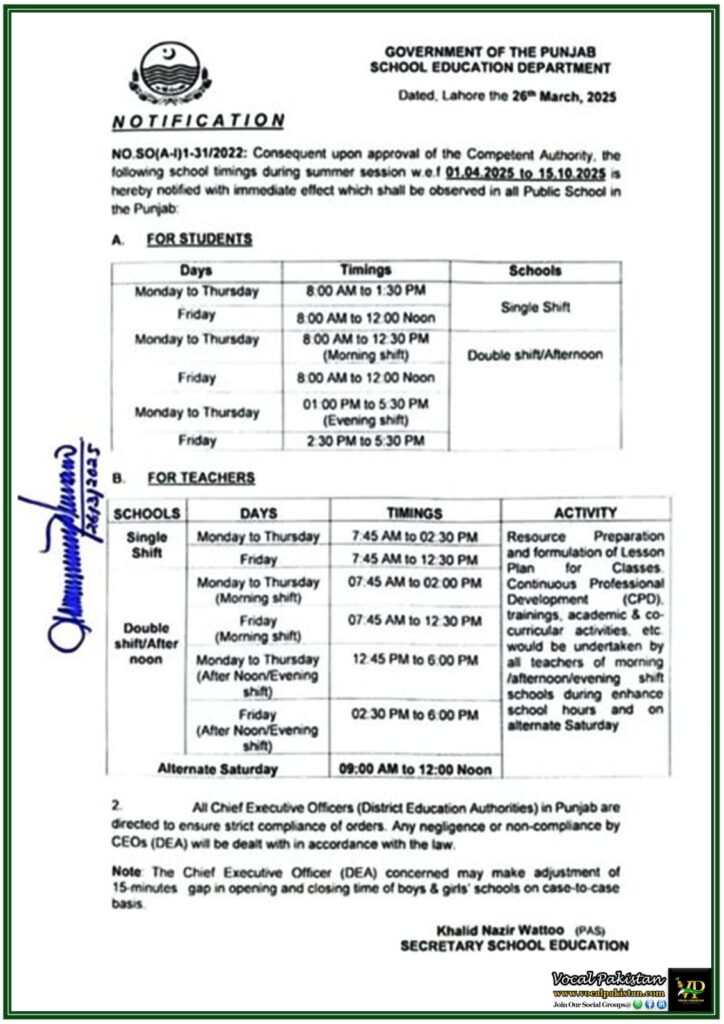 The Punjab School Education Department has issued a new notification regarding school timings for the upcoming summer session (April 1, 2025, to October 15, 2025). The revised schedule applies to all public schools across Punjab and includes adjusted morning and evening shifts to accommodate students and teachers effectively.