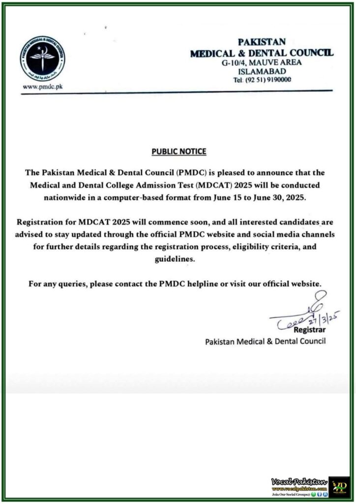 The Pakistan Medical & Dental Council (PMDC) is pleased to announce that the Medical and Dental College Admission Test (MDCAT) 2025 will be conducted nationwide in a computer-based format from June 15 to June 30, 2025.