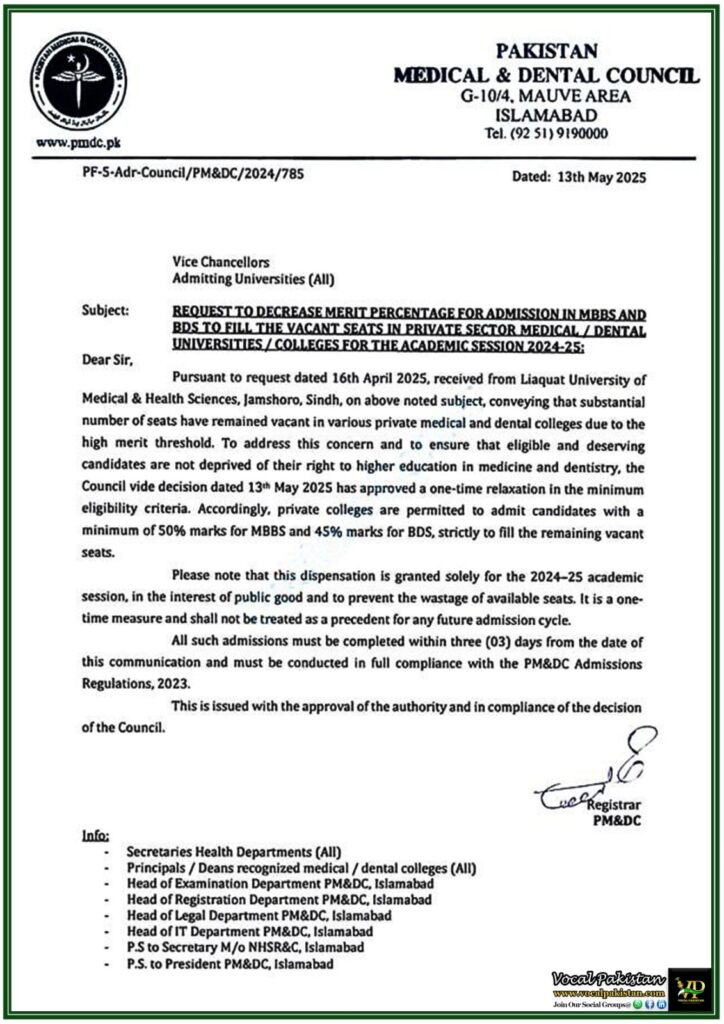 Pursuant to request dated 16th April 2025, received from Liaquat University of Medical & Health Sciences, Jamshoro, Sindh, on above noted subject, conveying that substantial number of seats have remained vacant in various private medical and dental colleges due to the high merit threshold. To address this concern and to ensure that eligible and deserving candidates are not deprived of their right to higher education in medicine and dentistry, the Council vide decision dated 13th May 2025 has approved a one-time relaxation in the minimum eligibility criteria. Accordingly, private colleges are permitted to admit candidates with a minimum of 50% marks for MBBS and 45% marks for BDS, strictly to fill the remaining vacant seats.