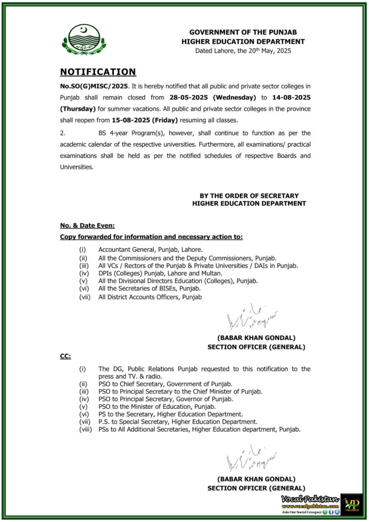 No.SO(G)MISC/2025. It is hereby notified that all public and private sector colleges in Punjab shall remain closed from 28-05-2025 (Wednesday) to 14-08-2025 (Thursday) for summer vacations. All public and private sector colleges in the province shall reopen from 15-08-2025 (Friday) resuming all classes.