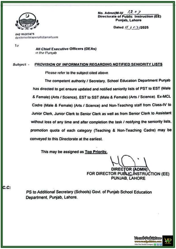 The Directorate of Public Instruction (EE), Punjab, Lahore, has issued an urgent directive to all Chief Executive Officers (DEAs) in Punjab regarding the immediate provision and notification of updated seniority lists.