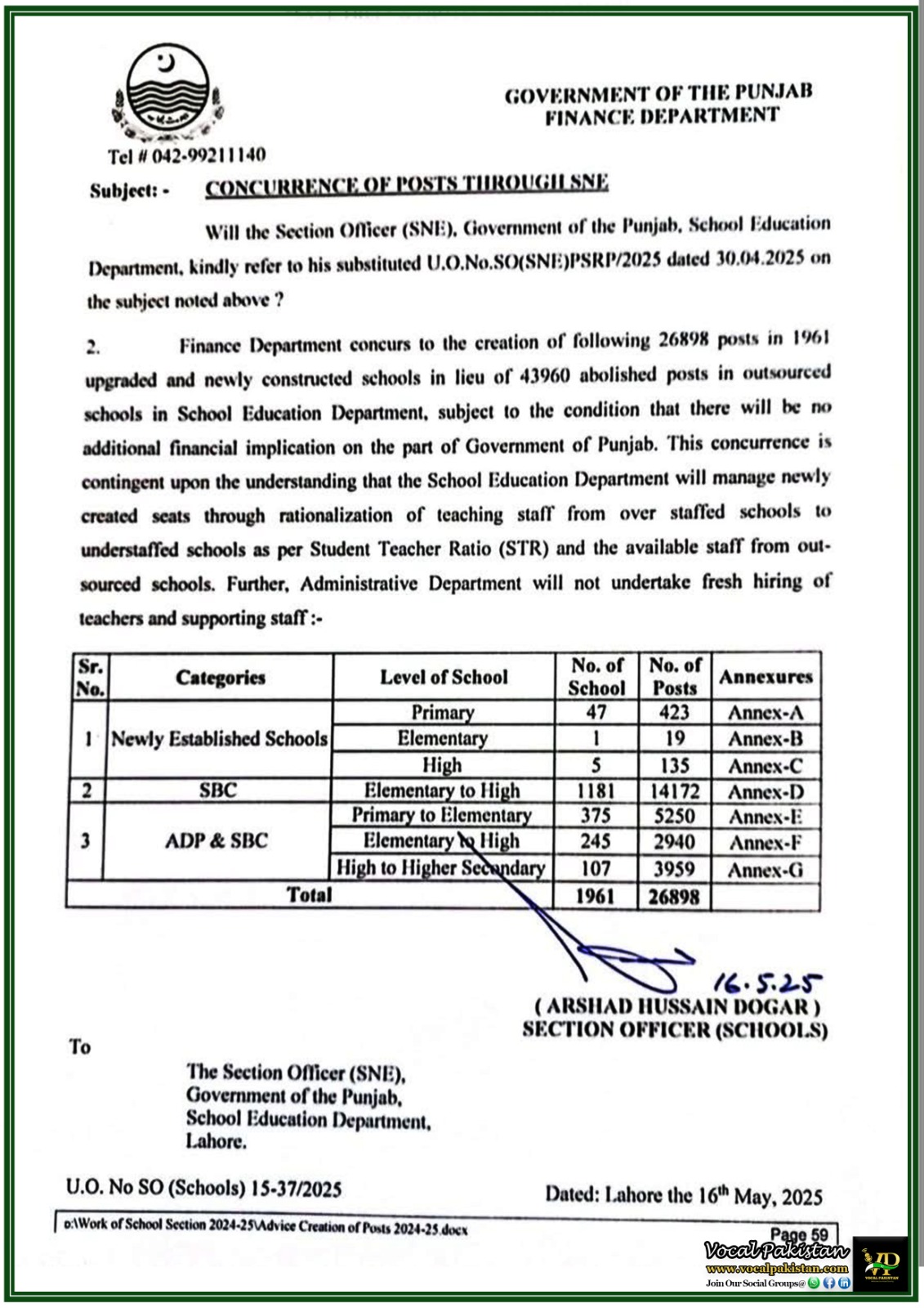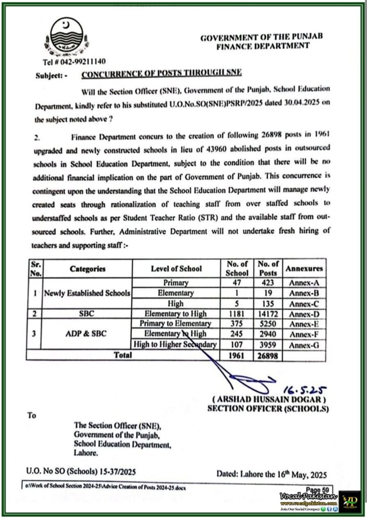 The Government of Punjab’s Finance Department has given a green signal to a massive restructuring of teaching positions in public schools across the province. As per the official Government Notification dated 16th May 2025, a total of 26,898 posts have been approved across 1,961 upgraded and newly established schools, effectively replacing 43,960 abolished posts from previously outsourced schools. This concurrence was issued to the School Education Department through the Section Officer (SNE), and is contingent upon key conditions such as no additional financial burden and the implementation of teaching staff rationalization based on the Student-Teacher Ratio (STR).