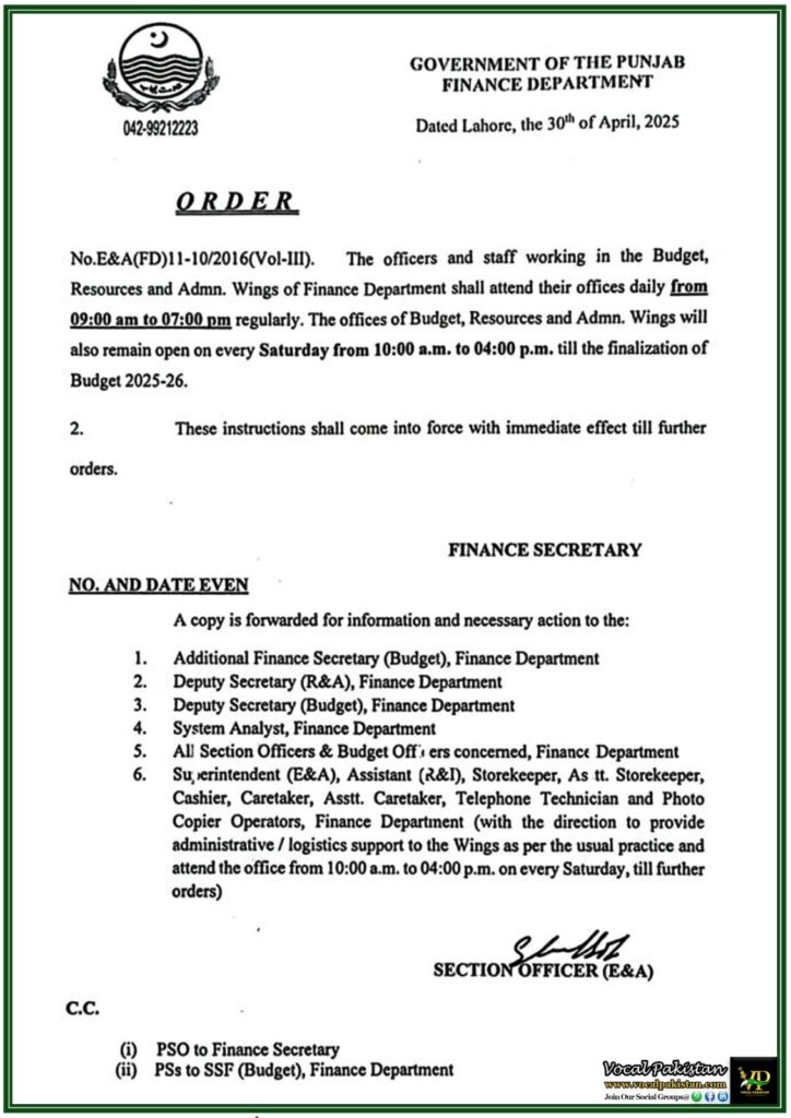 This step is part of the department’s active measures to ensure timely budgetary processes and improved administrative output. Those looking for updates on Punjab government office hours, finance department notifications, and official duty schedules in Lahore should stay tuned to Vocal Pakistan for the latest verified documents and announcements. Please find notification: