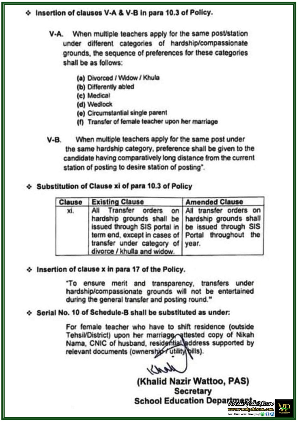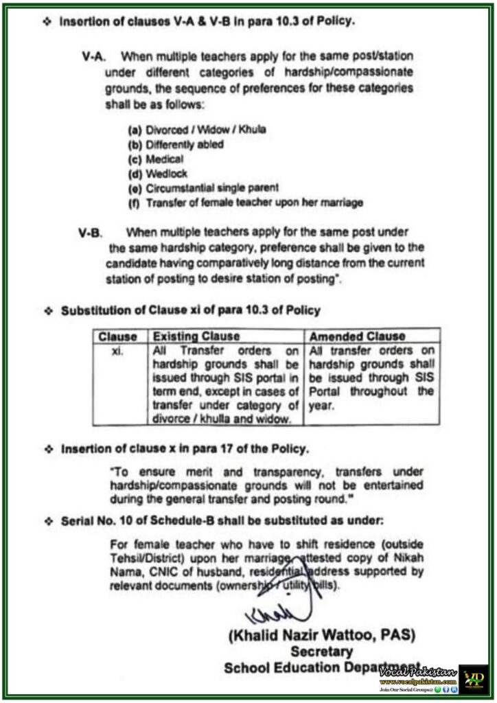 | xi. | All Transfer orders on hardship grounds shall be issued through SIS portal in term end, except in cases of transfer under category of divorce/khulla and widow. | All transfer orders on hardship grounds shall be issued through SIS Portal throughout the year. |