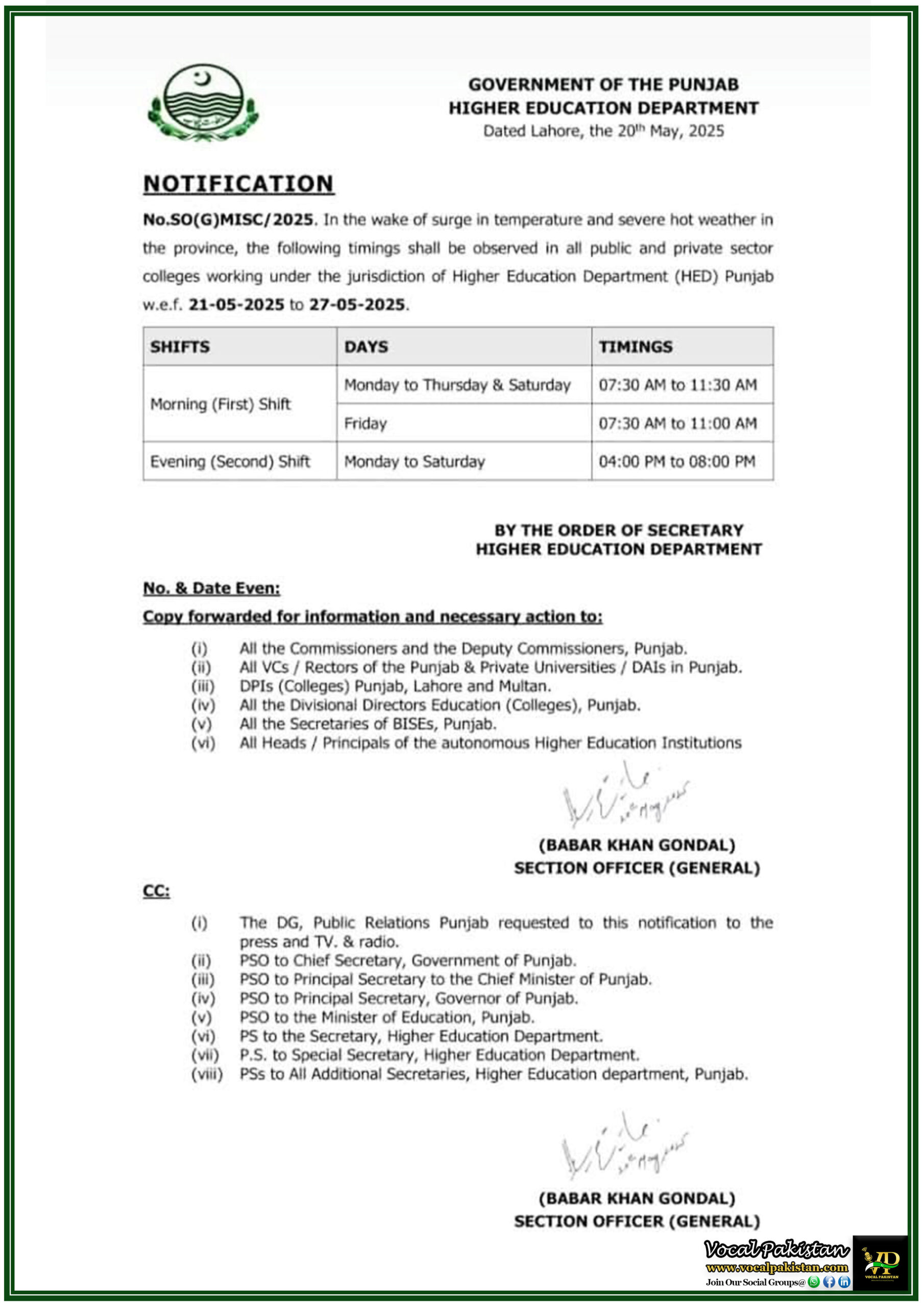 No.SO(G)MISC/2025. In the wake of surge in temperature and severe hot weather in the province, the following timings shall be observed in all public and private sector colleges working under the jurisdiction of Higher Education Department (HED) Punjab w.e.f. 21-05-2025 to 27-05-2025.