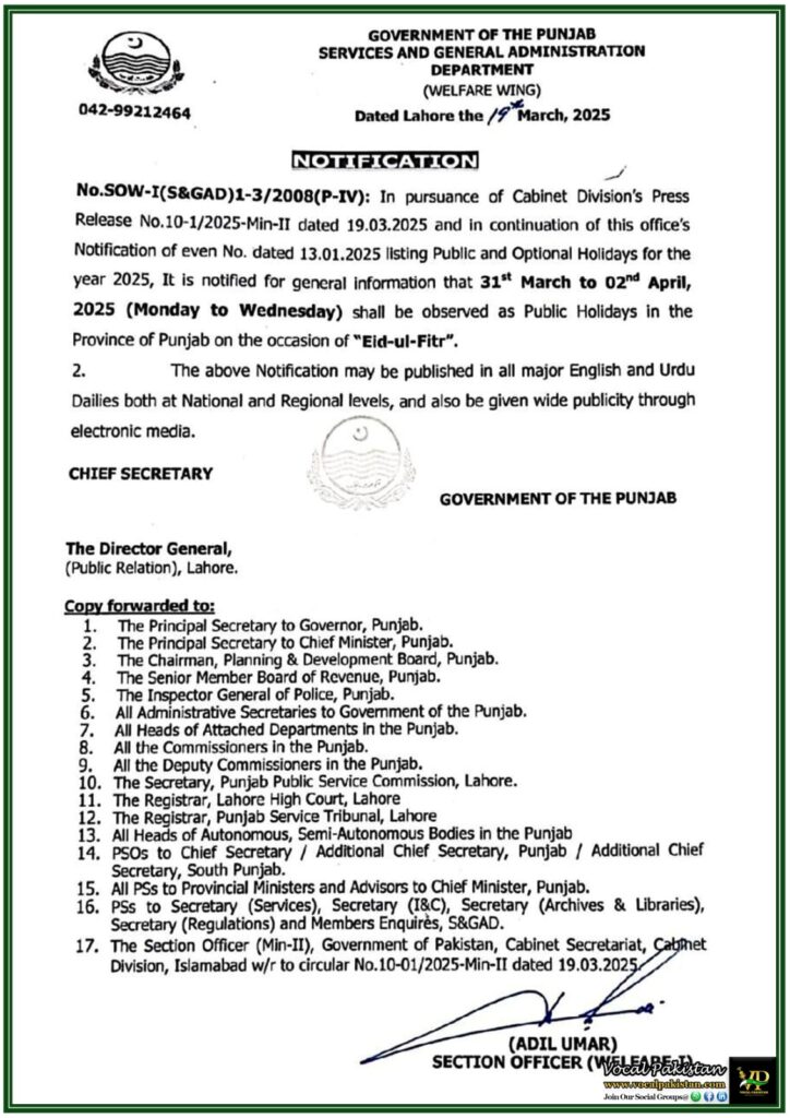 No.SOW-I(S&GAD)1-3/2008(P-IV): In pursuance of Cabinet Division’s Press Release No.10-1/2025-Min-II dated 19.03.2025 and in continuation of this office’s Notification of even No. dated 13.01.2025 listing Public and Optional Holidays for the year 2025, It is notified for general information that 31st March to 02nd April, 2025 (Monday to Wednesday) shall be observed as Public Holidays in the Province of Punjab on the occasion of “Eid-ul-Fitr”.