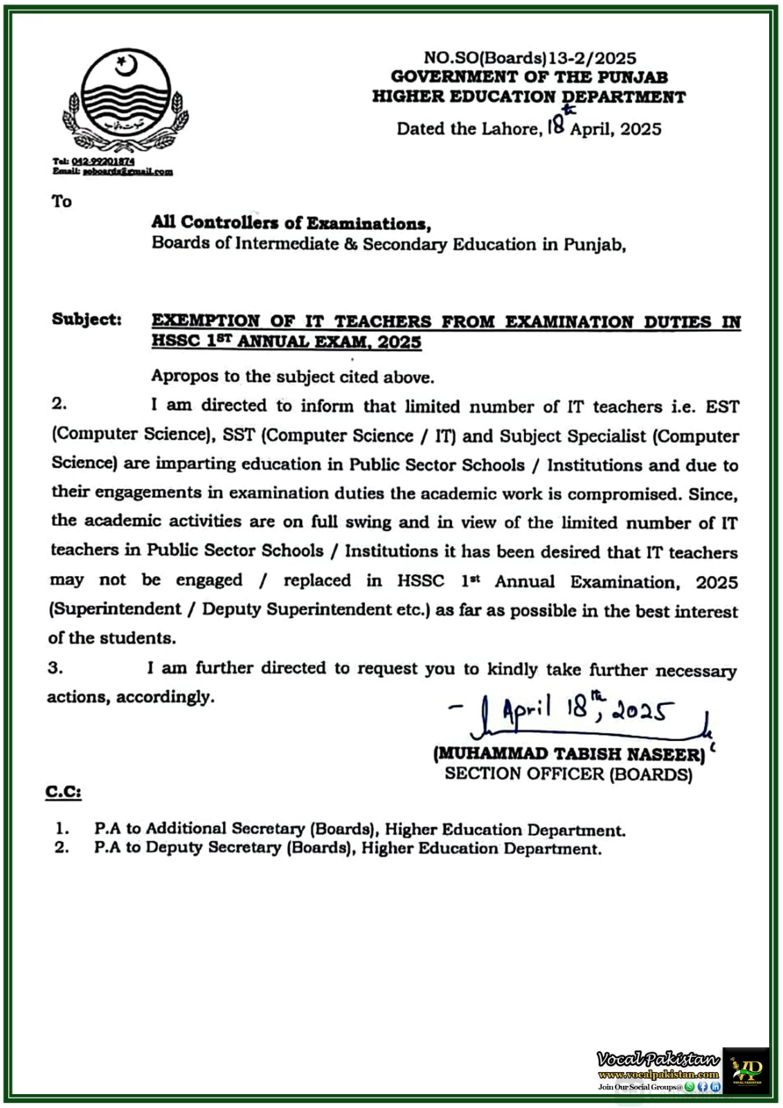 SUBJECT:             EXEMPTION OF IT TEACHERS FROM EXAMINATION DUTIES IN HSSC 1ST ANNUAL EXAM, 2025